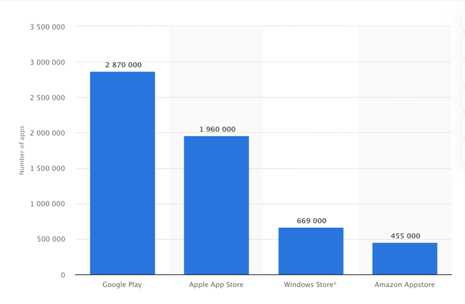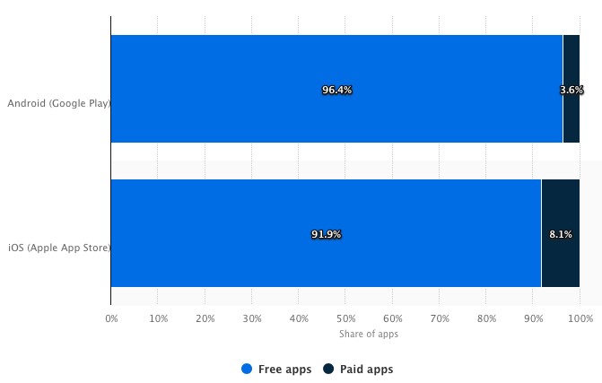 Echemos un vistazo al número de aplicaciones disponibles en App Store y en Google Play y a la predisposición de los usuarios a pagar, es decir, veamos cuál es la cuota de mercado de las aplicaciones de pago. Google Play cuenta con 2.800.000 aplicaciones móviles y App Store con 1.960.000 (según datos de Statista, correspondientes al tercer trimestre de 2020).